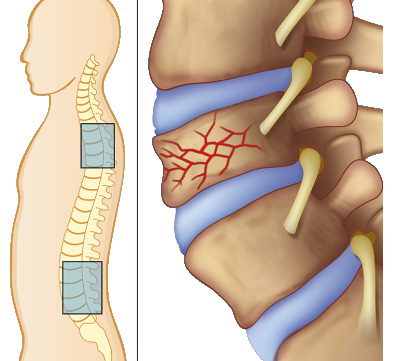 Depending on fracture severity, screws and rods may be used to stabilize the spine. Alternatively, vertebroplasty or kyphoplasty is done for compression fractures. Recovery includes bracing and guided mobility.